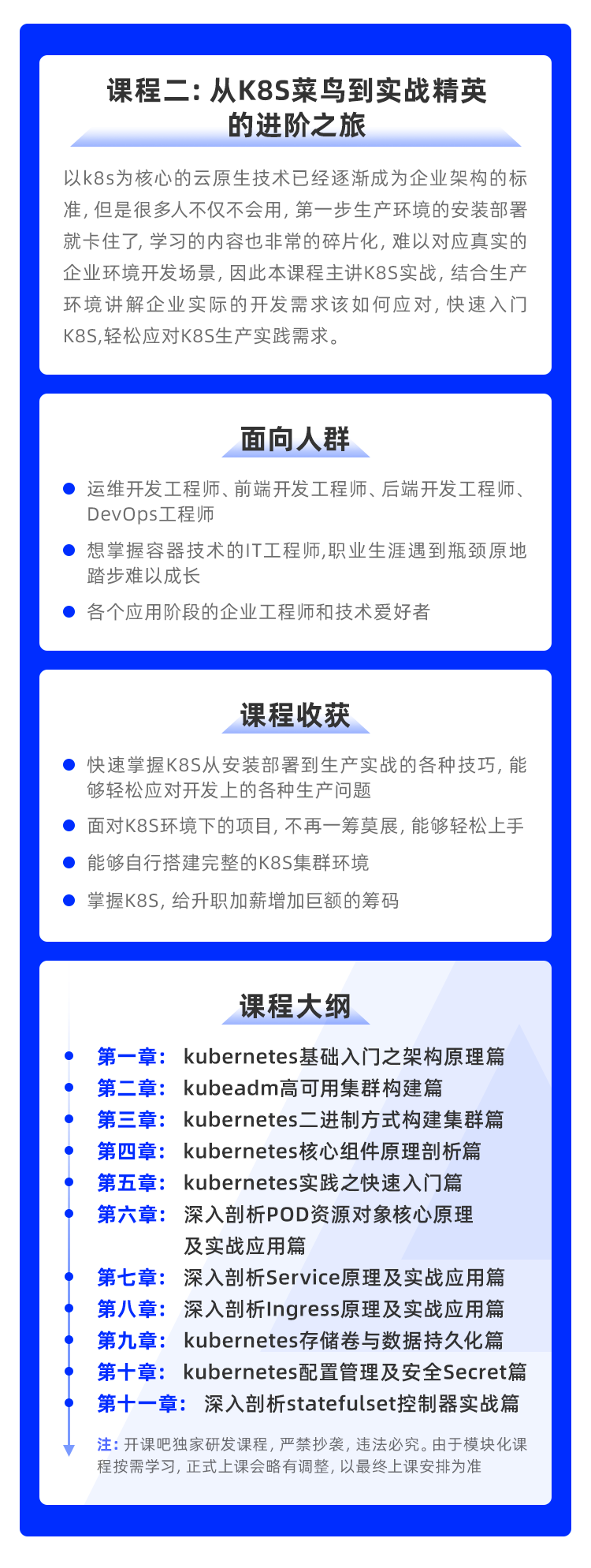 K8S作为容器化、云原生的杰出代表,配合微服务搭建完整架构已经成为业界标准,不管是后端开发人员还是运维人员都需要掌握该技术,才能轻松应对现在互联网飞速发展的架构要求,否则很难胜任对应架构下的开发工作。