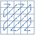 在图像编码的算法中,需要将一个给定的方形矩阵进行Z字形扫描(Zigzag Scan)。给定一个n×n的矩阵,Z字形扫描的过程如下图所示: