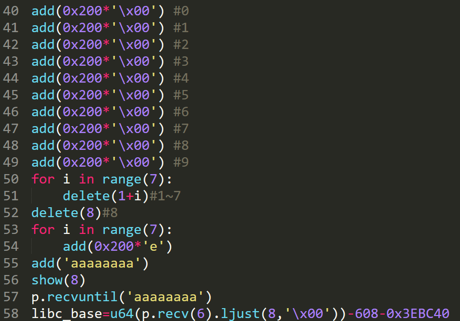 这个 就是 填满了 tcache 再分配了 一个unsortbin的 chunk 然后free 就是在fd 和bk上写入了main_arena 的上地址,然后 再mallo回来的时候 把前面的 fd写满 就能 泄露了