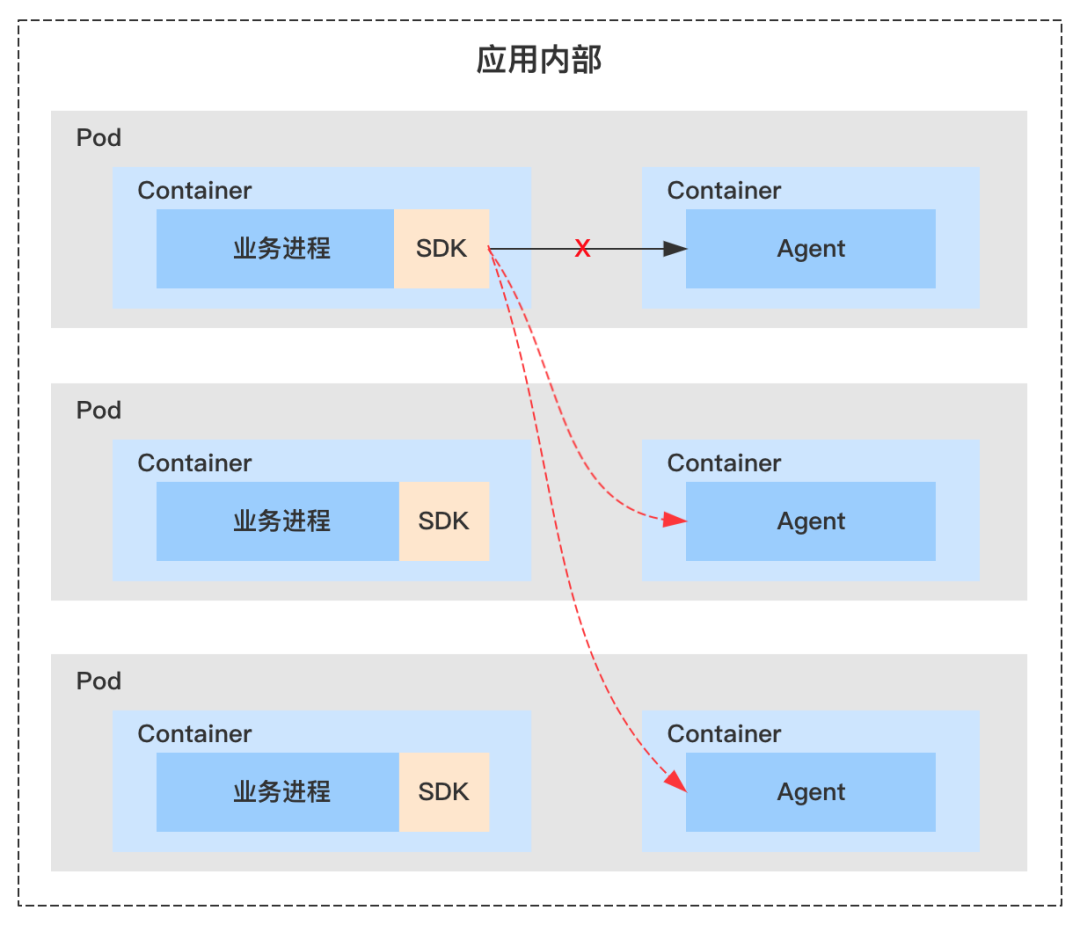 对于少数 Agent 仅代理出流量的场景,在 Agent 发生异常时 SDK 可以将流量切换至本应用的其他 Agent。由于同应用内的 Agent 具有相同的配置、资源、鉴权要求,这一切换过程具有最小的切换代价和最高的稳定性。