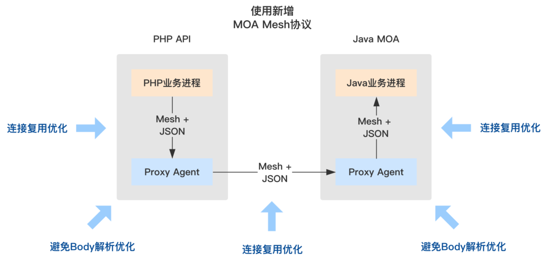 在众多影响 Agent 流量代理性能的因素中,通信协议是最关键的环节之一。MOA 原有的协议不支持可扩展的 header 字段,在转发请求时需要 decode 整个 Request 的字节数据才能获得服务名等路由信息。这种情况下需要新增一种传输协议,使请求转发时能够避免解析 Request Body 产生的开销。新协议同时需要对原 Redis GET 协议不支持单连接并行处理请求的问题进行连接复用优化,使代理转发性能达到最优。