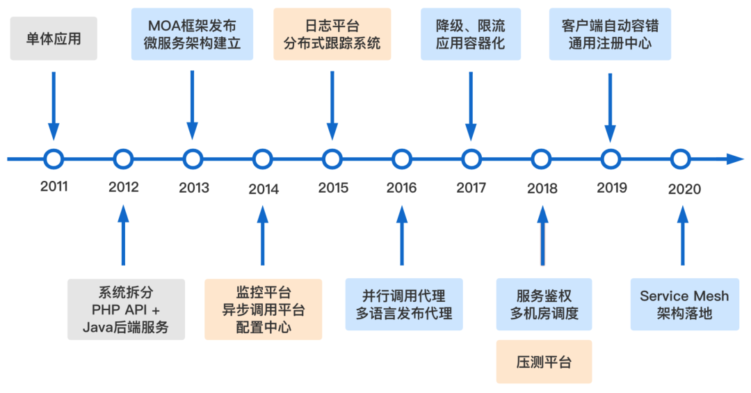 回顾陌陌整个微服务体系的发展历程,2011 年还是在使用单体应用,2012 年开始拆分系统,2013 年自研了微服务框架 MOA,2017 年实现了应用容器化,2020 年落地 Service Mesh 架构。