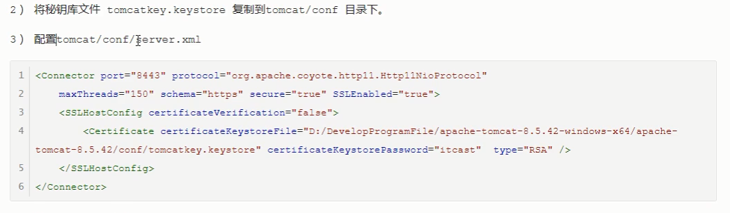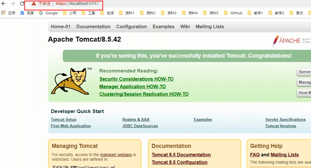 4.1 配置安全 4.1 配置安全 4.2 应用安全 4.2 传输安全 4.2.1 HTTPS 介绍 4.2.2 Tomcat 支持HTTPS 1) 生成秘钥库文件 4)访问 Tomcat 界面如下 来源:oschina链接:https://my.oschina.net/u/4115727/blog/3111976 标签 Tomcat