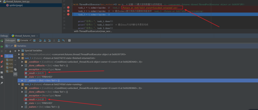运行结果可以看出,提交任务后立即判断任务状态时,显示3个任务都未完成。过了1.5秒后再次判断,发现task_1已执行完毕,task_2和task_3 还在执行中,最后主程序结束,task_2和task_3也执行完毕输出任务完成的字眼。使用Future类中的result方法获取任务的返回值,即图中的_result的值: