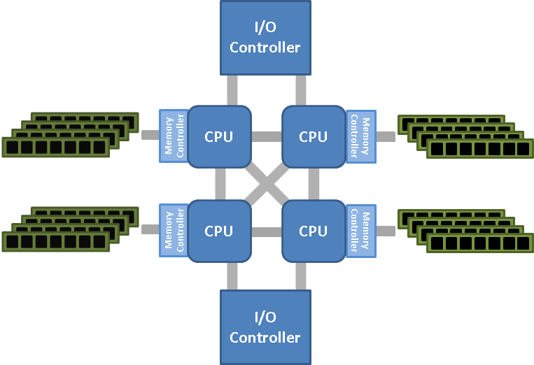 NUMA:非一致存储访问结构(Non-Uniform Memory Access)。假设一个 CPU 里面有 4 个核,每个核访问任何一个内存地址所用的时间都不太一样。如下图所示:
