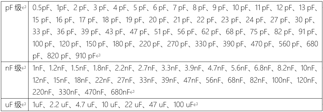 实际生产的电容的陶瓷容量值也是离散的,常用电容容量如下表: