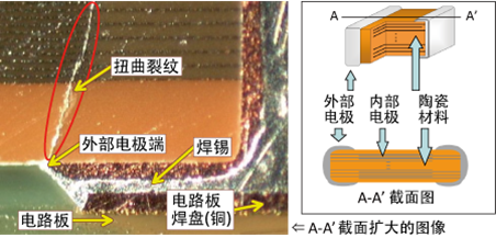 扭曲裂纹从下面的外部电极的一端延伸到上面的外部电极的话,容量就会下降,使得电路呈现出开路状态(开放)。因此,即使裂纹不是十分严重,如果到达贴片内部电极,焊剂中的有机酸和湿气会通过裂纹的缝隙侵入,导致绝缘电阻性能降低。另外,电压负荷会变高,电流的流量过大时,最糟糕的情况会导致短路。