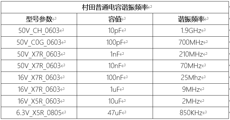 下图是村田常用电容的谐振频率表: