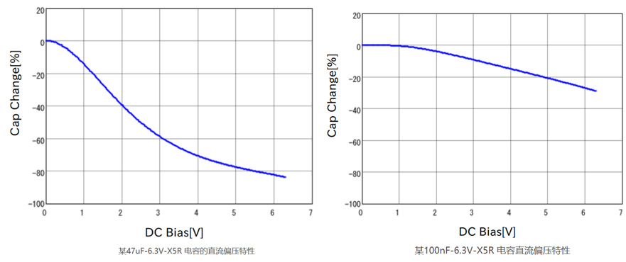 容值越高的电容,直流偏压特性越明显,如47uF-6.3V-X5R的电容,在6.3V电压处,电容量只有其标称值的15%左右,而100nF-6.3V-X5R的电容容值为其标称值的,如下图。