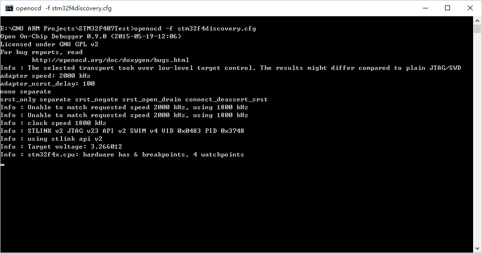 在工程文件所在的文件夹中打开命令窗口,键入openocd -f stm32f4discovery.cfg而后回车,此时命令窗口应如下图所示: