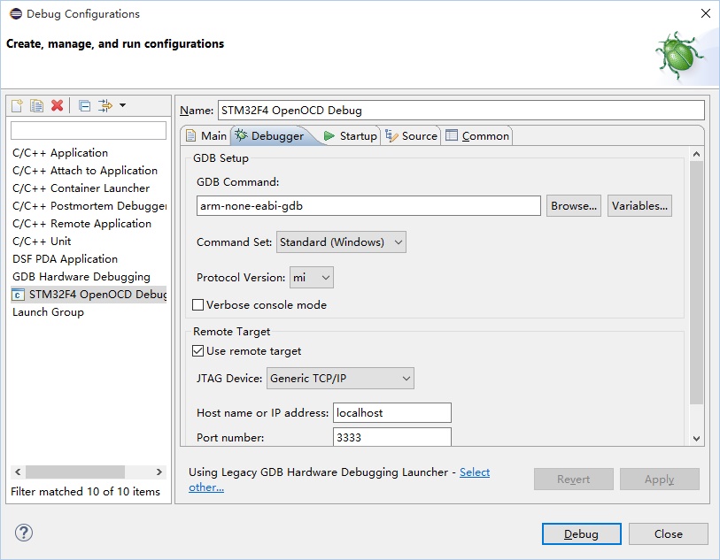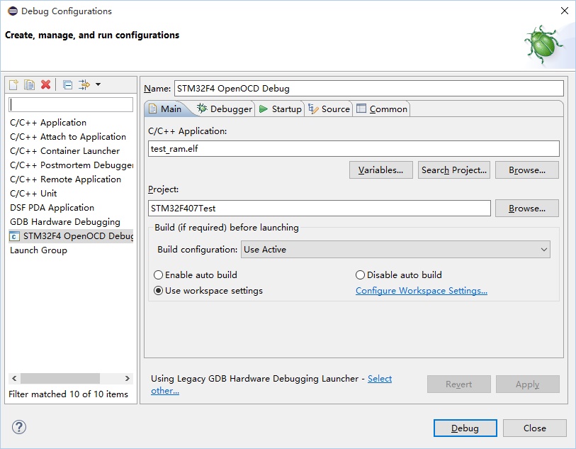 - 依次点击Select other -> Change Workspace Settings,选中GDB Hardware Debugging下的Debug,在右侧选择Legacy GDB Hardware Debugging Launcher,点击Apply保存设置。