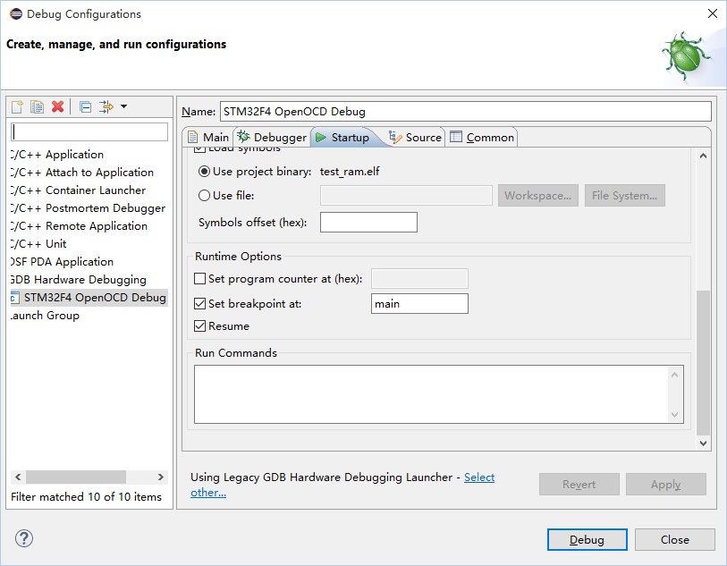 依次点击Run -> Debug Configurations,双击左侧的GDB Hardware Debugging创建新的配置,Main标签页设置如下图所示: