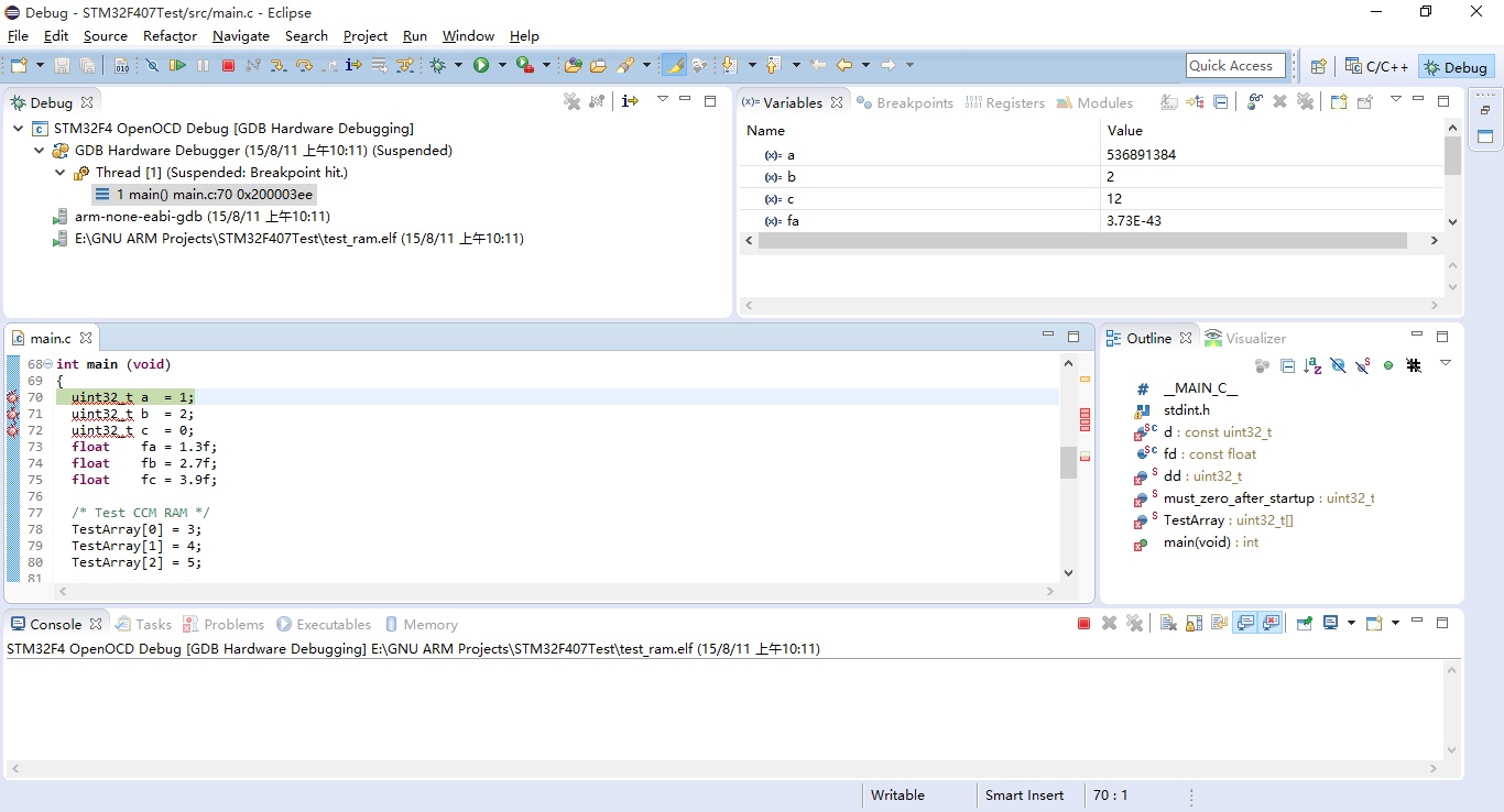 - 点击工具栏上的debug图标旁的倒三角符号,选择STM32F4 OpenOCD Debug,运行结果如下图所示: