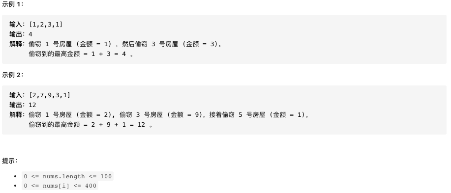 给定一个代表每个房屋存放金额的非负整数数组,计算你 不触动警报装置的情况下 ,一夜之内能够偷窃到的最高金额。
