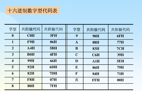 一个数码管有八段:A,B,C,D,E,F ,G,H,DP,即由八个发光二极管组成,; 因为发光二极管导通的方向是一定的(导通电压一般取为1.7V),这八个发光二极管的公共端有两种: +5V(即为共阳极数码管)、接地(即为共阴极数码管),其中共阳极每个段均有0导通,而共阴极则1导通发光,所以共阳极数码管和共阴极数码管显然是不同的,段选码表如下图所示: