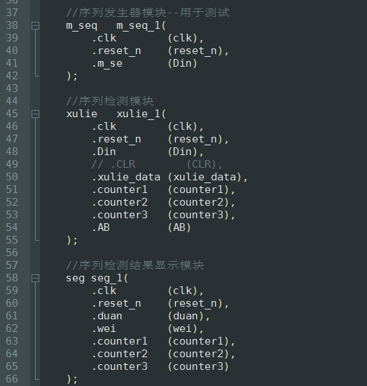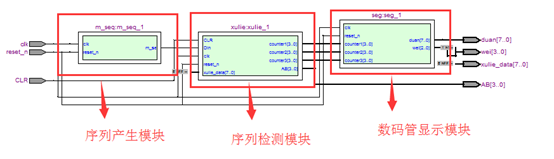 本设计主要分为3个模块:序列产生模块、序列检测模块、检测结果数码管显示模块。