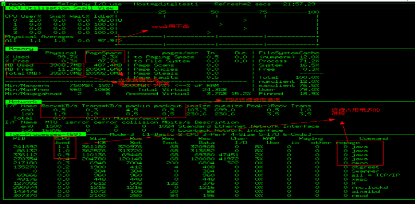 分别输入c 、t 、n 、m,可以了解系统cpu ,内存, 消耗资源最高的线程的使用情况。