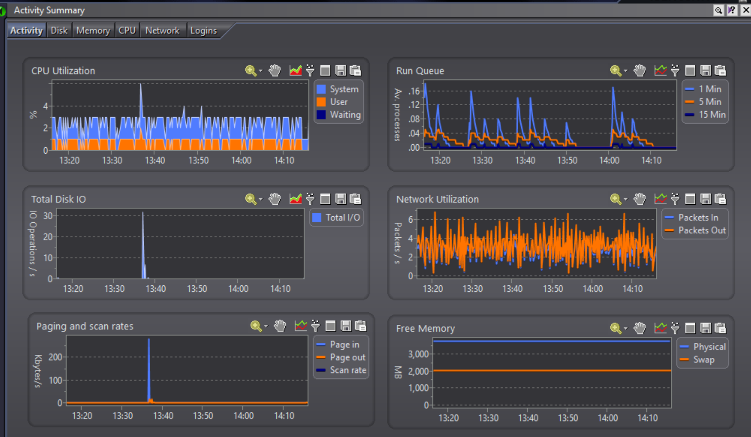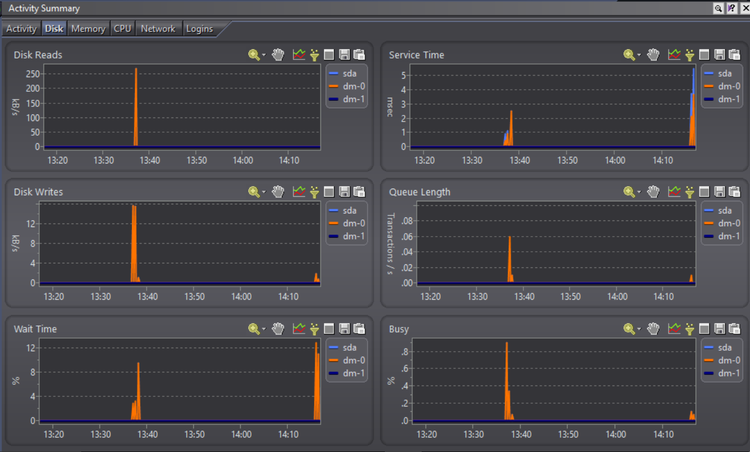 对IO频繁的系统,磁盘IO有可能成为系统的性能瓶颈。检查磁盘的I/O情况首 先查看磁盘的繁忙情况,如下图显示的是每个磁盘运行时间变化的磁盘繁忙 状态的比例。