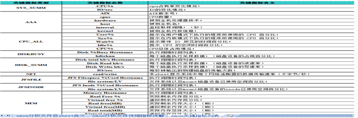 1. 各sheet页含义解释 2. nmon分析文件详细指标解释 3. nmon关键指标列表