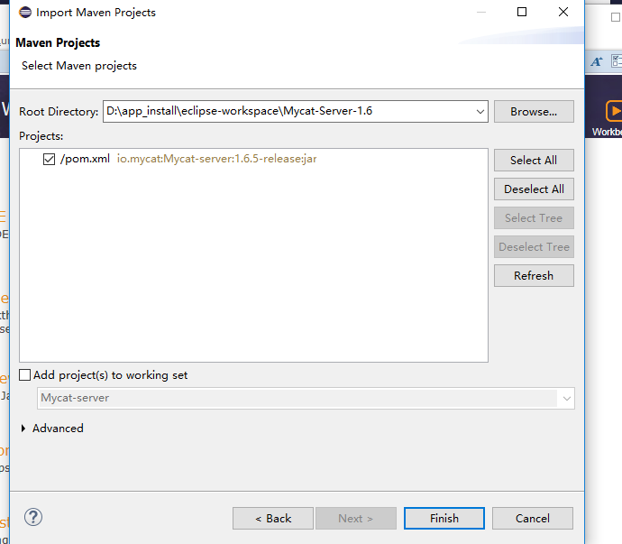 File -> Import 选择 Existing Maven Projects,浏览选择我们clone的mycat源码,点击确定开始进行导入。第一次导入需要等待maven下载插件以及mycat项目需要用到的第三方依赖库,等待时间相对长一点(mycat源码包地址:https://github.com/MyCATApache/Mycat-Server.git)