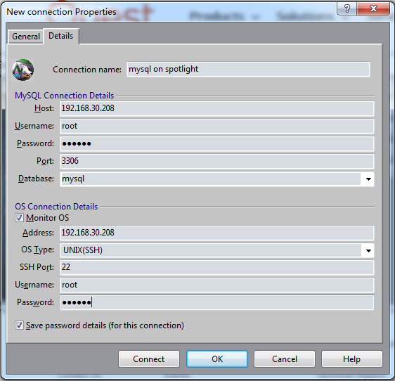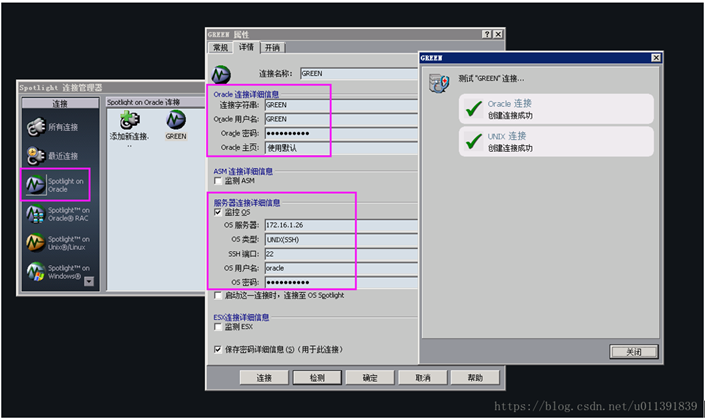输入被监控的服务器IP地址,spotlight用户账号及其密码,填充完OK即可。