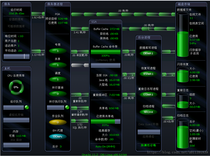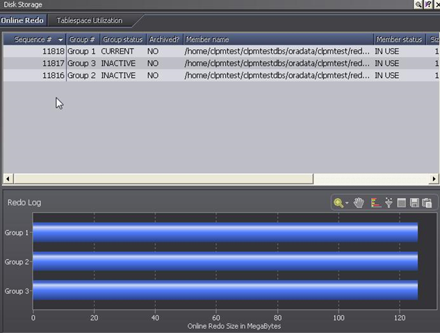 9)、磁盘存储情况:显示表空间利用率和在线日志的使用情况。
