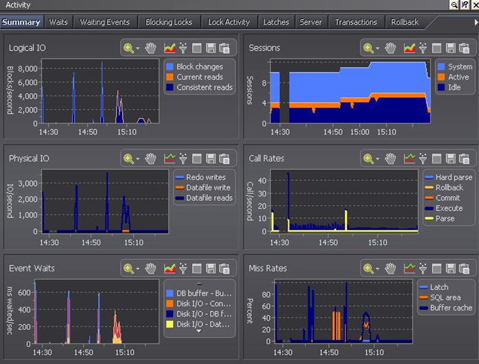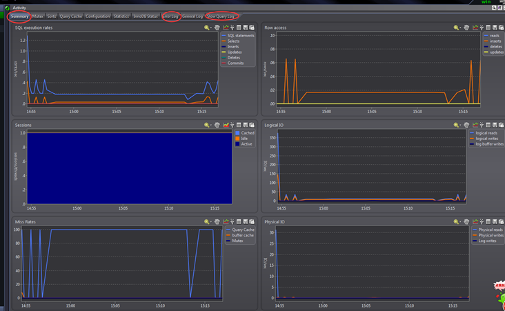 Activity:这个窗口,主要提供了等待事件,锁等待,闫锁等待,当前事务等。可以以图表方式查看磁盘、IO、事件等待等信息;