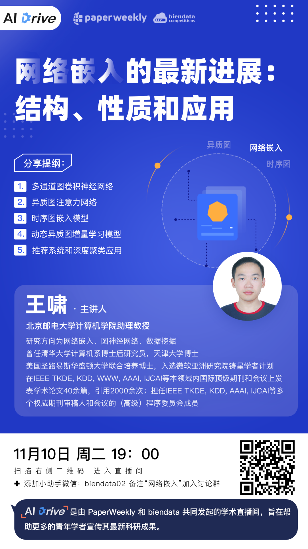 本期 AI Drive,我们邀请到北京邮电大学计算机学院助理教授王啸,为大家带来网络嵌入的最新进展:结构、性质和应用的专题直播。对本期主题感兴趣的小伙伴,11 月 10 日(周二)晚 7 点,我们准时相约 PaperWeekly B 站直播间。