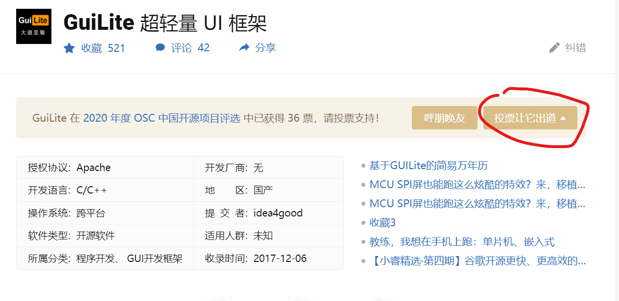 最后,阴差阳错的,GuiLite要去跟一批优秀的JavaScript项目去竞争“前端软件”的TOP 10,既来之则安之,不求金榜题名,但求不要输得太难看。如果你觉得本文对你有些所启发,也请随手投票支持一下GuiLite(https://www.oschina.net/p/guilite):