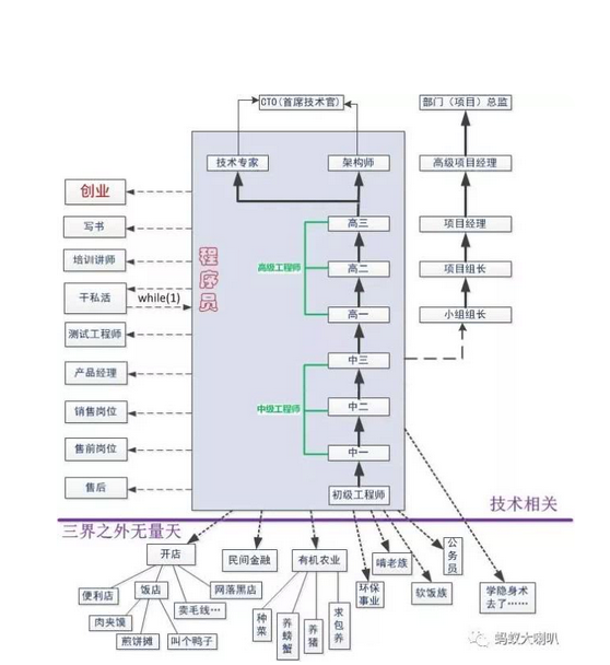 最近在琢磨程序员到底路在何方,经过不断的自虐和代入,终于在迷雾森林中得图一张,看之豁然开朗。独乐乐不如众乐乐,share了: