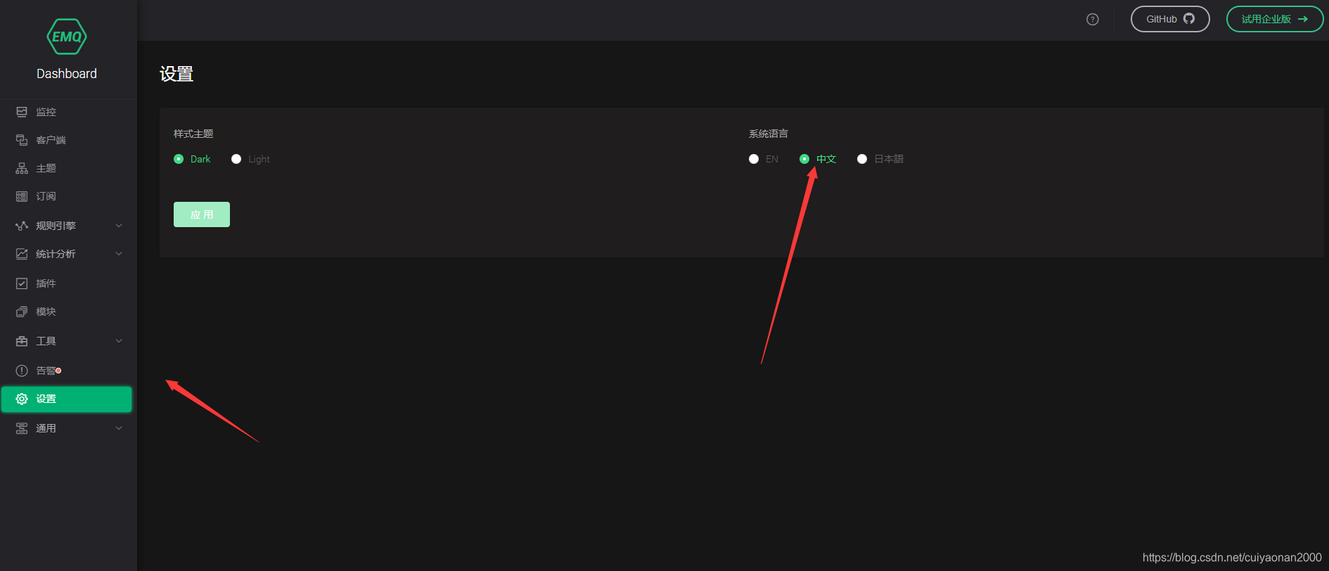 访问 http://127.0.0.1:18083,默认用户名: admin,密码:public,如图所示,登录后先修改下版本语言为中文。方便我们使用