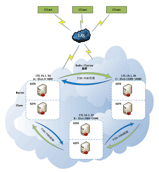 - Redis-cluster把所有的物理节点映射到[0-16383]Slot上(不一定是平均分配),Cluster 负责维护node<->slot<->value。