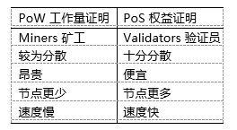 2012 年,PoS 作为点点币(Peercoin)的介绍首次被提出。PoS 是 PoW 的一种升级共识机制,不需要消耗电力来进行运算,根据每个节点记账权的获得难度,令其与节点持有的权益成反比,等比例的降低挖矿难度,从而加快找随机数的速度。为了保证其简单,PoS 中没有矿工(Miners),而是改为了验证员(Validators)。仍然是基于哈希运算竞争获取记账权的方式,容错性与PoW 相同。PoS 是基于矿工们目前拥有的数字货币数量分配,一种根据你持有货币的量和时间进行利息分配的制度,在 PoS 模式下,你的“挖矿”收益与你的币龄成正比,而与电脑的计算性能无关。
