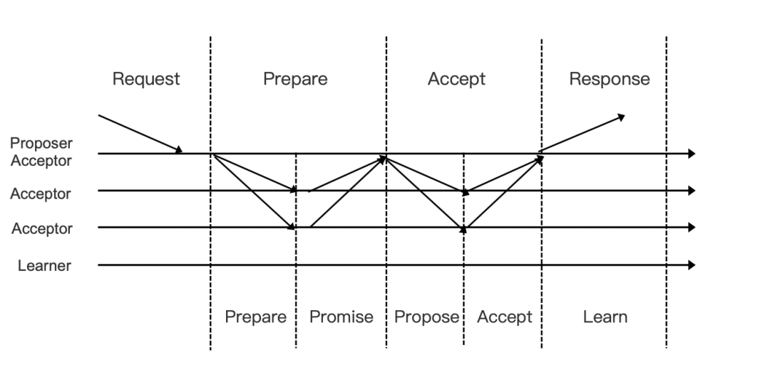 4. Accept: Acceptor 收到 Propose 请求后,在不违背自己之前作出的承诺下,接受并持久化当前Proposal ID 和提案 Value。