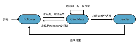 Candidate 候选人Leader选举过程中的临时角色。会向其他结点“拉选票”,如果得到大部分的票则成为Leader。