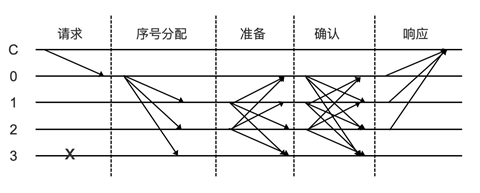 一致性协议至少包含若干个阶段:请求(request)、序号分配(pre-prepare)和响应(reply)。根据协议设计的不同,可能包含相互交互(prepare),序号确认(commit)等阶段。