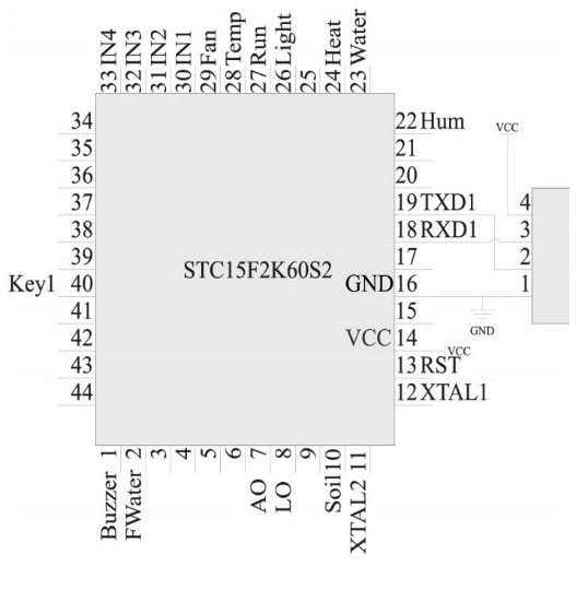 STC15F2K60S2单片机是一种新型单片机,其速度远超早期51单片机,内部具有高精度R/C时钟,常温下温飘也相对较低。单片机外部硬件接线如图2所示。芯片的14管脚(VCC)接+5V供电,16管脚接地实现给单片机供电。它的27、26、24管脚分别是运行指示、补光指示、加热指示,各自连接一个限流电阻保证LED的正常运行。而23、29管脚分别连接浇水水泵和风扇的继电器驱动端。