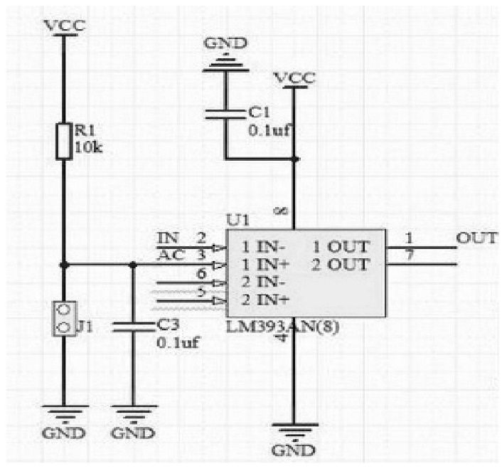 YL69土壤湿度传感器,采用不锈钢防水探针,可以满足定点监测和在线测量。通过将传感器的两个插片插在土壤里,测得当前的土壤湿度值,通过IN端与LM393相连。LM393是一个比较器,通过R1设置一个标准值,当湿度大时,OUT端输出低电平,相反输出高电平。OUT信号可以直接用来粗略估算湿度大小,具体电路如图6所示。