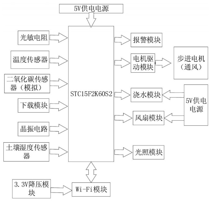 系统由STC15F2K60S2单片机、光照模块、温湿度检测模块、CO2检测模块、土壤湿度检测模块、通风模块、风扇降温模块、自动浇水模块、报警模块、无线通信模块、机智云物联网平台、手机APP组成。