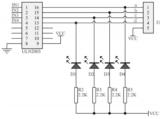 本设计采用ULN2003驱动步进电机实现窗户的开闭,具有电流较大且耐压能力强的特点。工作电压为5V,可直接与TTL以及CMOS电路直接相连,还能直接处理本需要标准逻辑缓冲器来处理的数据。芯片外部VCC接+5V电源,GND接地。IN1~IN4是ULN2003的四个输入控制信号端,高电平有效。它主要构成脉冲(驱动信号)给电机用。