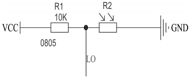 光敏电阻是一种随着光照强度改变阻值大小的元器件。在光照增强时,阻值变小;在光照减弱时,阻值增大[2]。通过光敏电阻的特性来开关灯源,从而实现自动补光功能。光敏电阻接线图如图3所示。在一定电压的条件下,当光照强度越大则电阻越小,对应的电流越大,反之则电流越小。电路中光敏电阻串联一个10K的电阻用来限流。单片机上的8管脚引出LO获得当下的电流值与限值作比较,只有当LO处所在电路的电流值小于预设值时,打开补光灯(LED6),其余情况补光灯关闭。