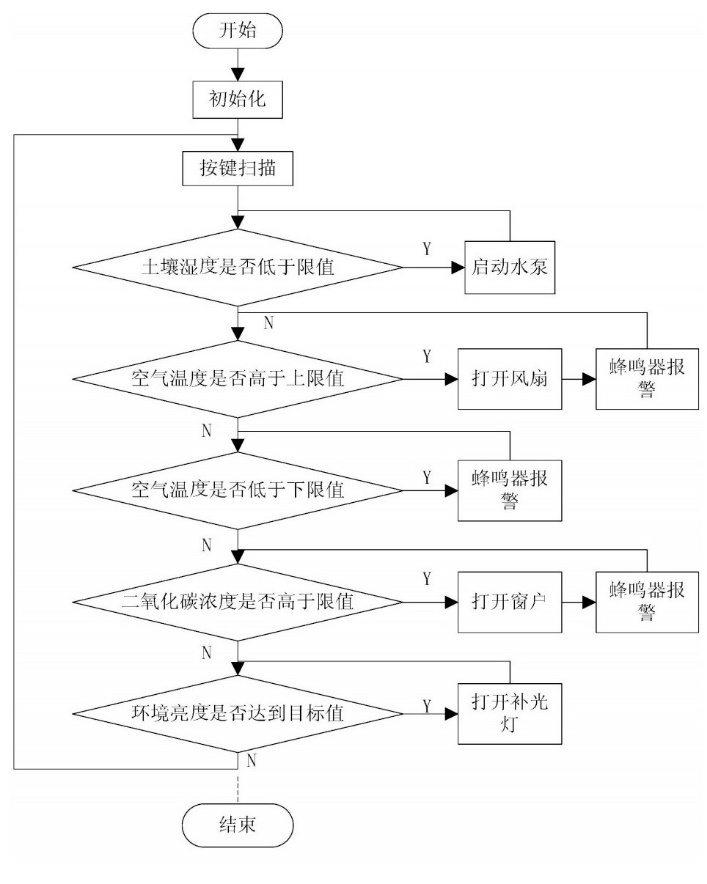 第四步检测空气中的二氧化碳是否超过限值,若超过二氧化碳浓度限值则打开窗户通风并启动蜂鸣器报警,若没有达到二氧化碳浓度限值则继续往下执行程序;最后一步是检测光线亮度是否达到标准,若没有达到亮度标准则打开补光灯进行补光,若达到亮度标准则返回初始化,继续进行下一次循环。