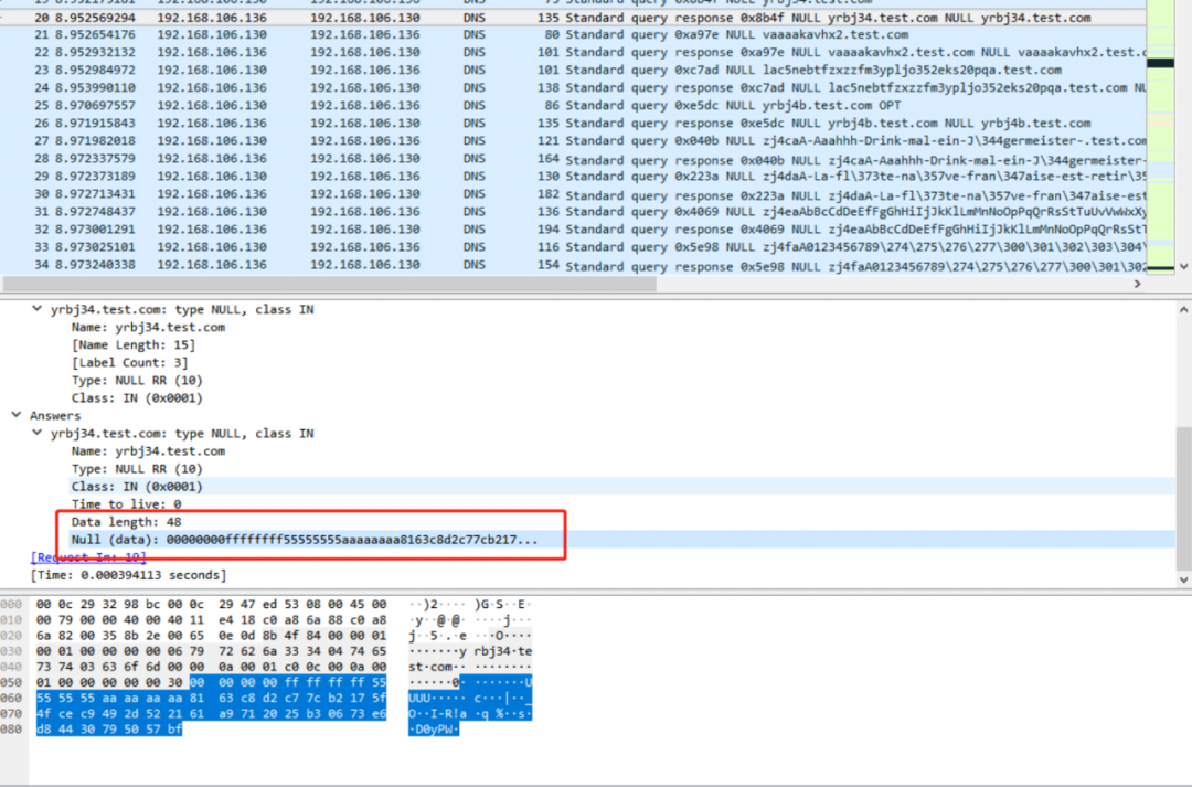 在test.com前的字段为加密字段(Iodine支持base32,base64,base128等多种编码规范),这里使用了NULL查询类型。