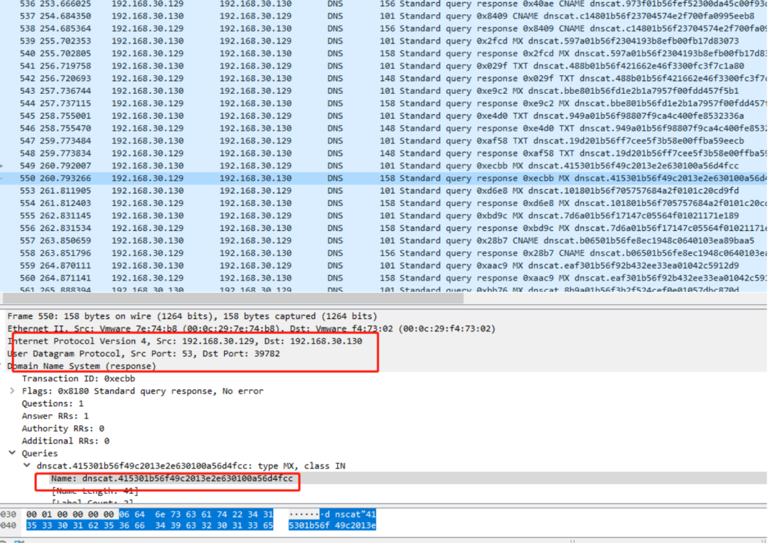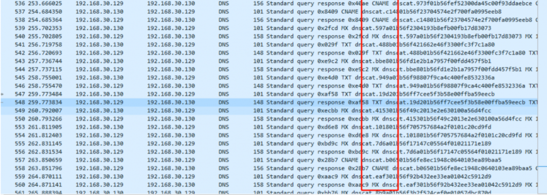 可以看到dnscat2通过dns协议的请求包,封装了加密后的指令执行结果。