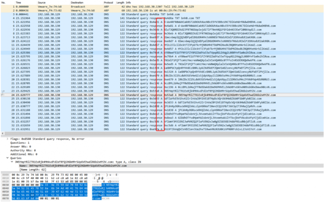 还可以看到所有dns包的udp五元组都是相同的,受控端和C&C复用了同一个udp会话进行dns隧道通信,dnscat2通过加密手段隐藏了CC服务器的域名,隐蔽性很好。