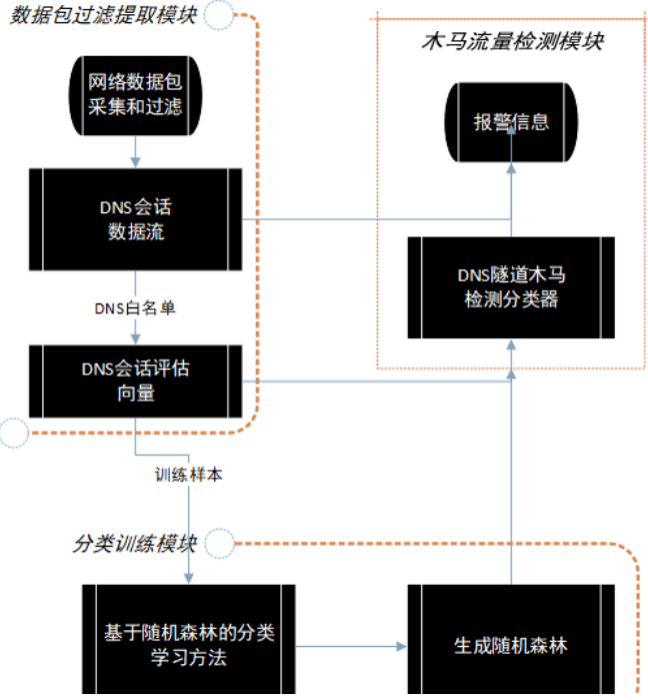 可以结合协议本身,基于通信行为检测隧道木马,,采用 Winpcap 数据包捕获技术的底层过滤机制,抓取 DNS 流量.将抓取的 DNS 流量按照五元组进行聚类,形成 DNS 会话数据流.将一个个 DNS 会话数据流提取成 DNS 会话评估向量,作为分类训练模块和木马流量监测的输入。(机器学习)