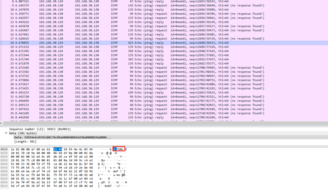 对于隧道数据,icmptunnel 首先会指定客户端和服务器端。随后,客户端会将 IP 帧封装在 ICMP 请求数据包中发送给服务器,而服务器端则会使用相匹配的 ICMP 响应数据包进行回复(icmptunnel 提供在状态机防火墙和 NAT 网络之间,更加可靠的连接)。