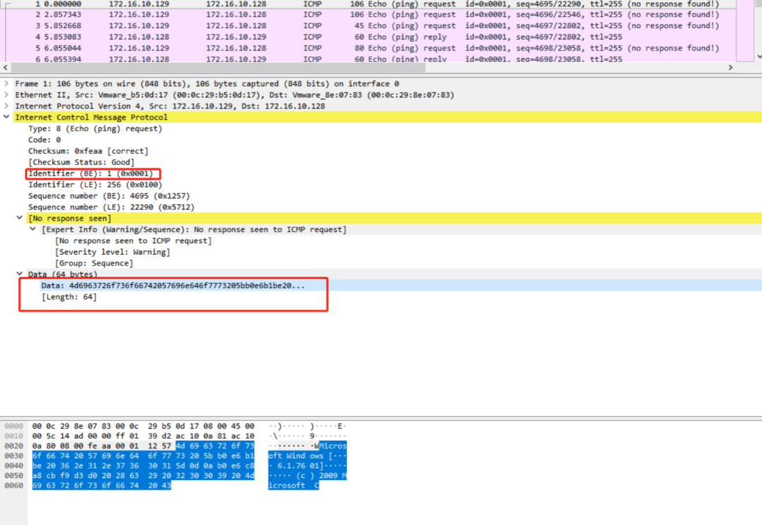 刚建立连接时是靶机不断发送icmp的请求包,区别于正常的icmp包,icmpsh的iIdentifier字段(相当于ping的进程号,winXP是0002)是默认写死的0001。