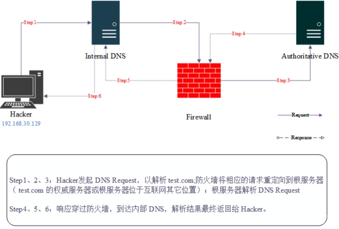在进行DNS查询时,如果查询的域名不在DNS服务器本机的缓存中,就会访问互联网进行查询,然后返回结果,如果互联网上有一台定制的服务器,那么依靠DNS协议即可进行数据包的交换。从DNS协议角度来看,这样的操作只是在一次次的查询某个特定的域名并得到解析结果,但其本质问题是,预期的返回结果应该是一个IP,而事实上返回的可以使任意字符,包括加密的C&C指令。