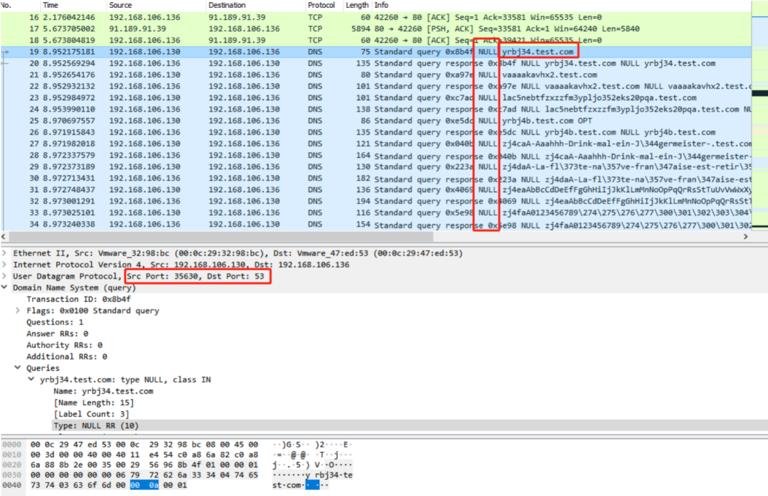 同时发现传输的五元组也都是相同的,受控机和攻击机是使用同一个udp会话进行DNS通信。